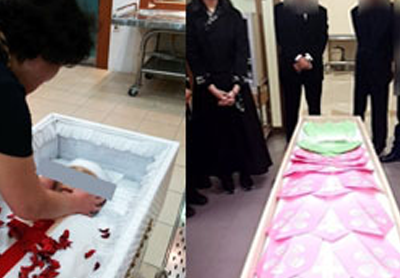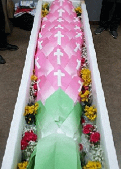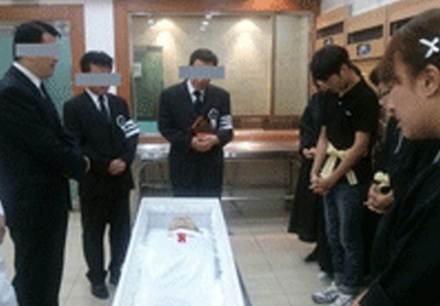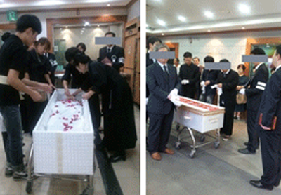 고인의 마지막 모습을 보며 장미로 이별을 고하는 모습